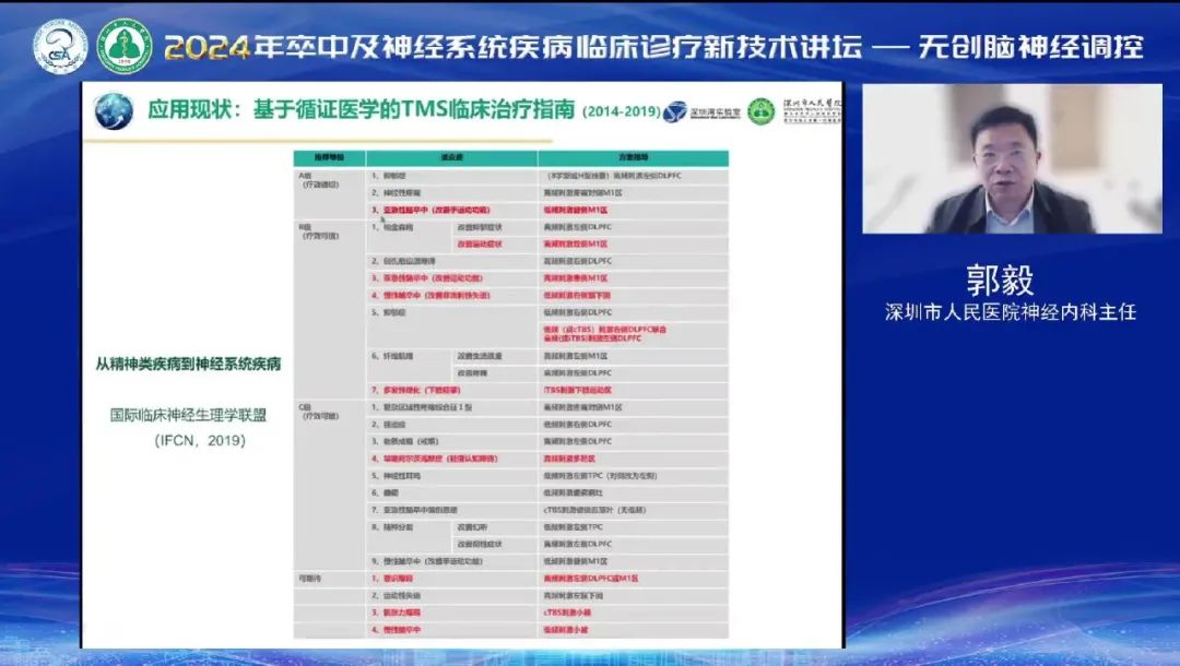 2019年國際臨床神經生理學聯盟(IFCN)發布了基于循證醫學的TMS臨床治療指南,囊括了從精神類疾病到神經類疾病各常見的適應癥以及方案指導。郭毅主任對常見的適應癥靶點及機制進行了講解。