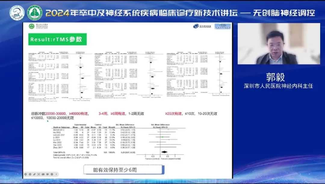 郭毅主任介紹了團隊即將發表的一篇薈萃分析——阿爾茲海默病中重復經顱磁刺激的潛力:一種優化干預策略的RCT薈萃分析。本篇共納入16篇文獻,結果提示TMS改善阿爾茲海默病總體認知功能是明顯有效的(p=0.0002)。對于各項TMS參數也進行了詳細分析,對臨床治療有很大的指導意義。