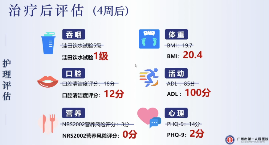 經過4周的精準化治療,患者在臨床、康復、護理方面都有了明顯的改善,能自主吞咽各種性狀的食物,達到康復出院的標準。出院后持續隨訪,得知患者并沒有再次出現吞咽困難或飲水嗆咳。