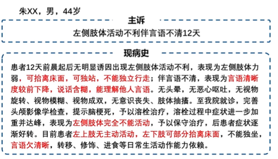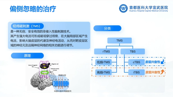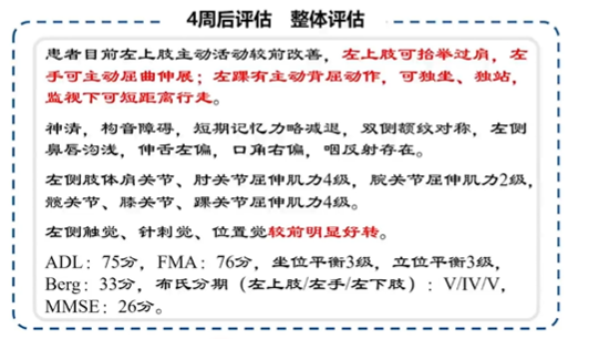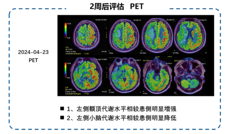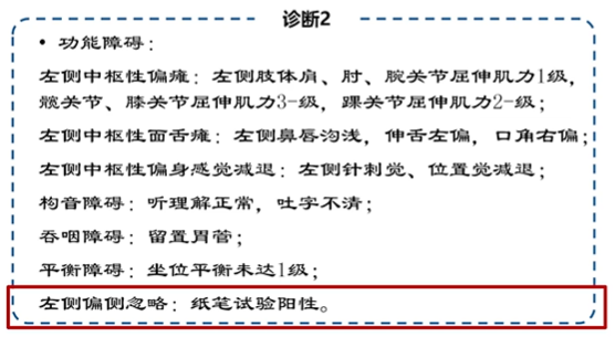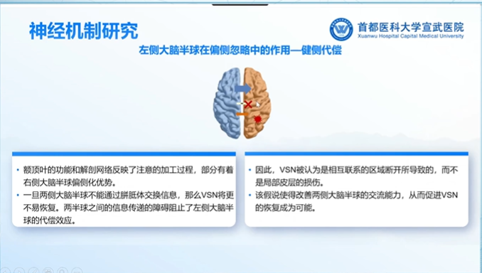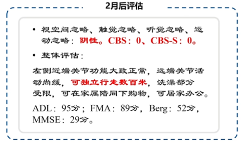 兩周后進行臨床評估發現:視空間忽略有改善(但是還存在),雙側感覺恢復,聽覺忽略陰性,同時對于自身忽略意識增強。