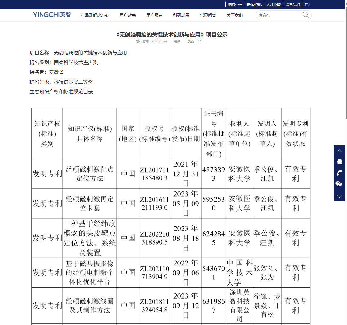 英智科技的經(jīng)顱磁刺激儀已通過中國NMPA、美國FDA、歐盟CE等認證。其產品在治療重度抑郁癥、慢性疼痛等領域的療效已獲多項臨床研究驗證。另外2025年其與國內多個研究機構聯(lián)合發(fā)表的《無創(chuàng)腦調控的關鍵技術創(chuàng)新與應用》項目,提名國家科技進步獎,進一步彰顯其技術實力。