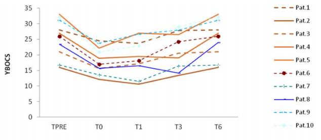 在這項研究中使用的主要測量系統是耶魯-布朗強迫癥量表(Y-BOCS),這是衡量強迫癥癥狀嚴重程度的金標準。結果發現,所有患者的強迫癥癥狀直至T1,其中4例至T3改善。與其他參與者相比,這些患者表現出更廣泛的額區相位同步和額頂相干的重塑。
