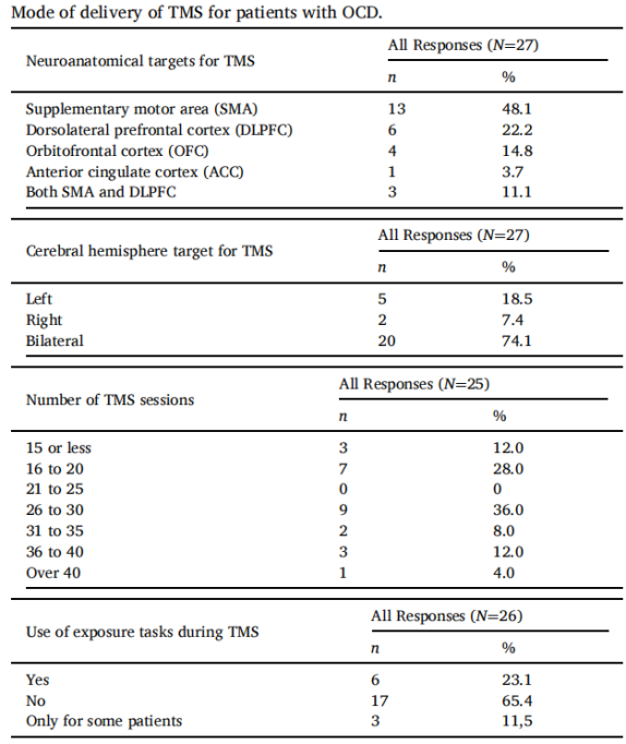 精神病學研究中心于2021年發表了一項針對強迫癥患者不同經顱磁刺激方案的國際調查,旨在評估目前TMS治療強迫癥患者的常用方案和治療趨勢。數據收集在20204月至6月期間進行,使用自研的包含10個項目的在線問卷,調查了國際上的強迫癥患者的TMS治療診所。總共分析了來自10個國家的27份有效答復。TMS最常見的目標是補充運動區,刺激通常給予雙側,但不同中心的技術不同。暴露任務在TMS中并不常用。調查結論顯示目前還需要進行更多的研究,明確經顱磁刺激治療強迫癥的最佳模式。[4]