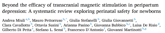 [1] Miuli A, Pettorruso M, Stefanelli G, Giovannetti G, Cavallotto C, Susini O, Pasino A, Bubbico G, De Risio L, Petta GD, Sensi SL, D'Antonio F, Martinotti G. Beyond the efficacy of transcranial magnetic stimulation in peripartum depression: A systematic review exploring perinatal safety for newborns. Psychiatry Res. 2023 May 22;326:115251. doi: 10.1016/j.psychres.2023.115251. Epub ahead of print. PMID: 37270864.