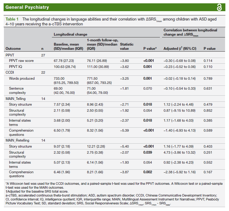 This study verified the feasibility, safety, and efficacy of a-cTBS targeting the left primary motor cortex (M1) in improving social communication impairment (SCI) in children with Autism Spectrum Disorder (ASD). The improvement was also associated with enhanced language abilities, suggesting that M1 may serve as a potential therapeutic target for ASD. The findings of this study were published in April 2025 in the journal General Psychiatry (IF = 6.8).
