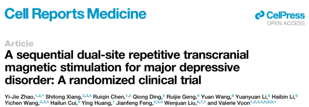 Zhao, Y. J., Xiang, S., Chen, R., Ding, Q., Geng, R., Wang, Y., Li, Y., Li, H., Wang, Y., Cui, H., Huang, Y., Feng, J., Liu, W., & Voon, V. (2025). A sequential dual-site repetitive transcranial magnetic stimulation for major depressive disorder: A randomized clinical trial. Cell reports. Medicine, 6(10), 102402. https://doi.org/10.1016/j.xcrm.2025.102402