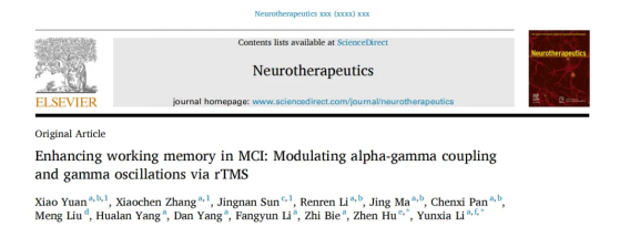 [4].Yuan, X., Zhang, X., Sun, J., Li, R., Ma, J., Pan, C., Liu, M., Yang, H., Yang, D., Li, F., Bie, Z., Hu, Z., & Li, Y. (2025). Enhancing working memory in MCI: Modulating alpha-gamma coupling and gamma oscillations via rTMS. Neurotherapeutics : the journal of the American Society for Experimental NeuroTherapeutics, e00619. Advance online publication. https://doi.org/10.1016/j.neurot.2025.e00619